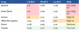 The bioconcentration factor (BCF) predicts how much metal a crop will accumulate relative to soil concentration. A BCF above 1.0 means the crop concentrates that metal. The differences between crops are dramatic: